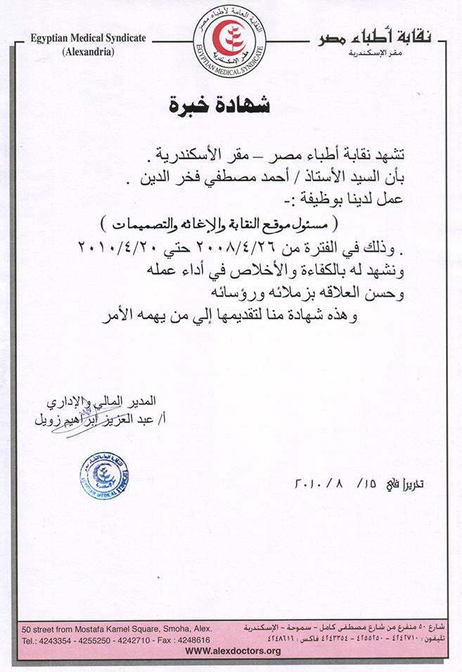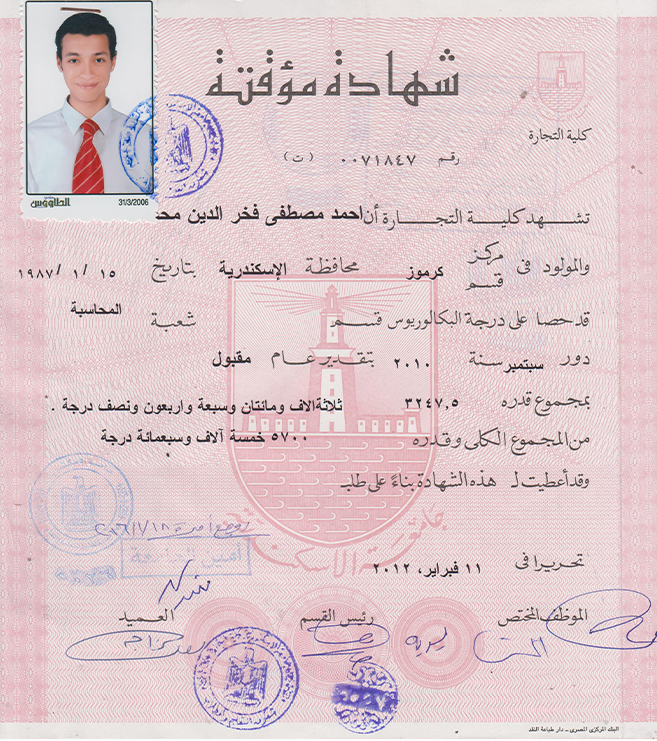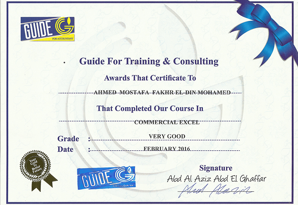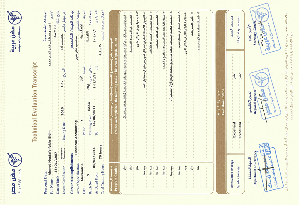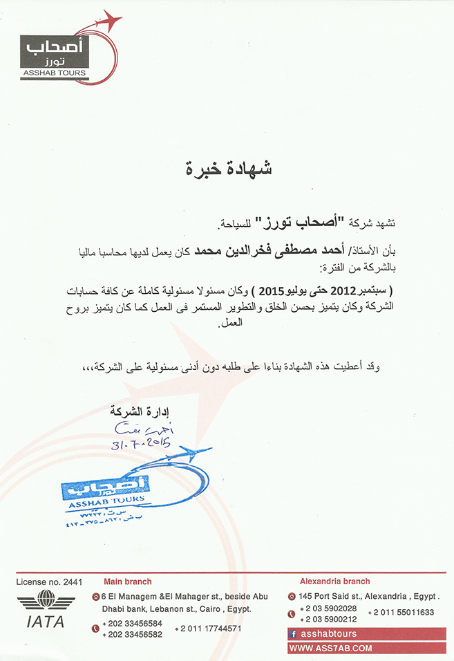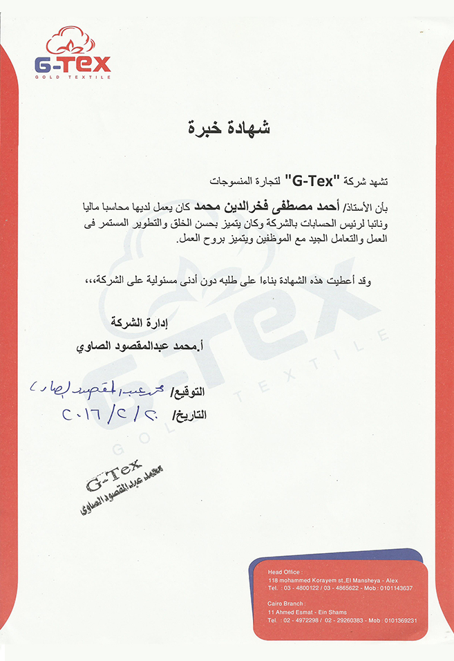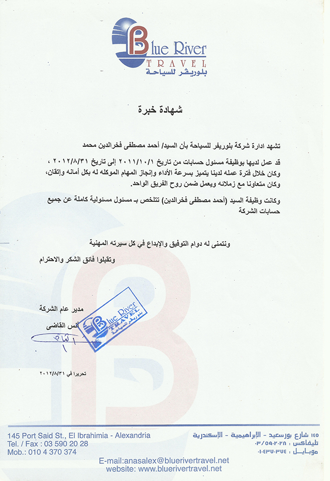 Hello, I’m Ahmed Fakhr El-Din. I Have 9 years of experience in Accounting. I started to work as an accountant in "Blueriver" tourism company. I started my accounting job from 2011 to 2015. Then I worked for "G-Tex" textile company until 2016 then I traveled to the Kingdom of Saudi Arabia and worked as Chief Of Accounts for "Bouquet Ward" Est. for 3 years. Then my current job as a senior accountant in "Al - Mawred Advanced" Contracting Company from 2019 until now.